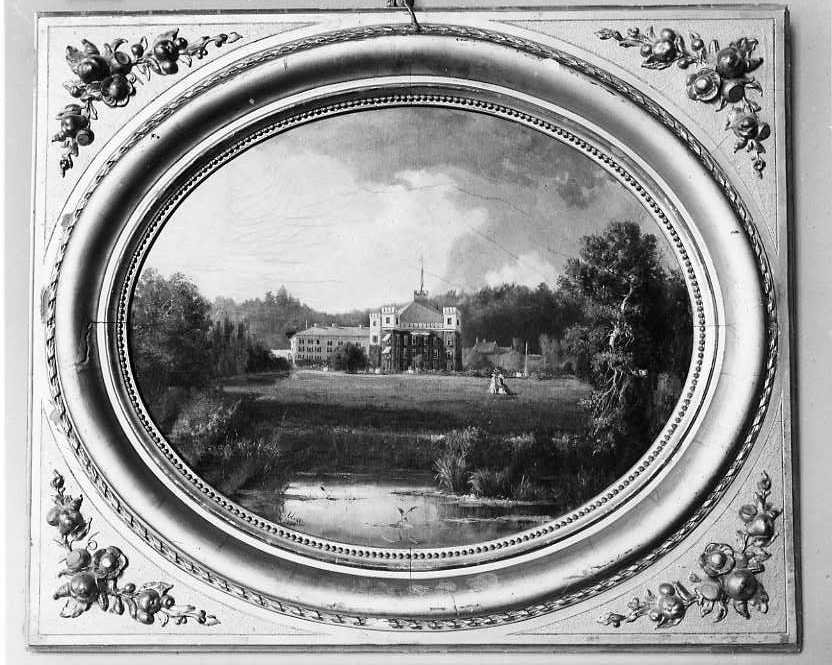 Il dipinto rappresenta un paesaggio nordico con un castello sullo sfondo eun giardino con due figure muliebri che vi passeggiano. In primo piano vi è un laghetto