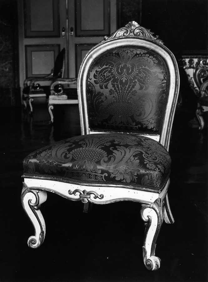 Sedia in legno intagliato e laccato bianco con profili dorati. Le gambe anteriori sono a forma di voluta e al centro della spalliera, in alto, intaglio a forma di ricciolo. Spalliera e sedile sono imbottiti e ricoperti di damasco rosso