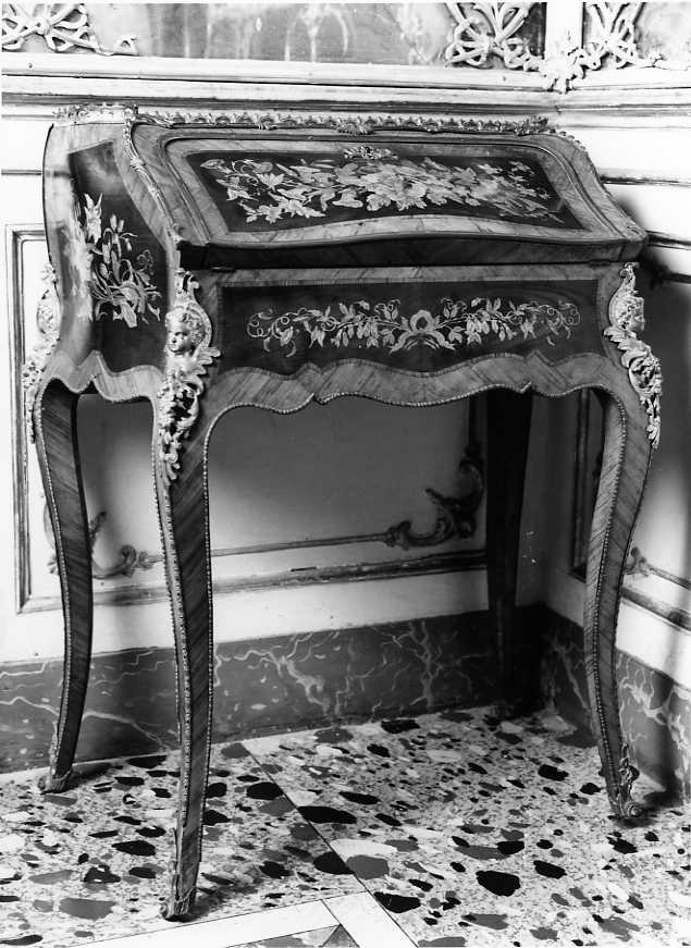 - NOTIZIE STORICO CRITICHE Questa tipologia di scrivanietta è tipica dello stile Luigi XV, ed ebbe molta fortuna tanto da essere replicata in forma pressocchè identica fino alla metà dell'Ottocento. Un esempio di questa data è riportato nella tav.ap. 200 in De Gregory 1960