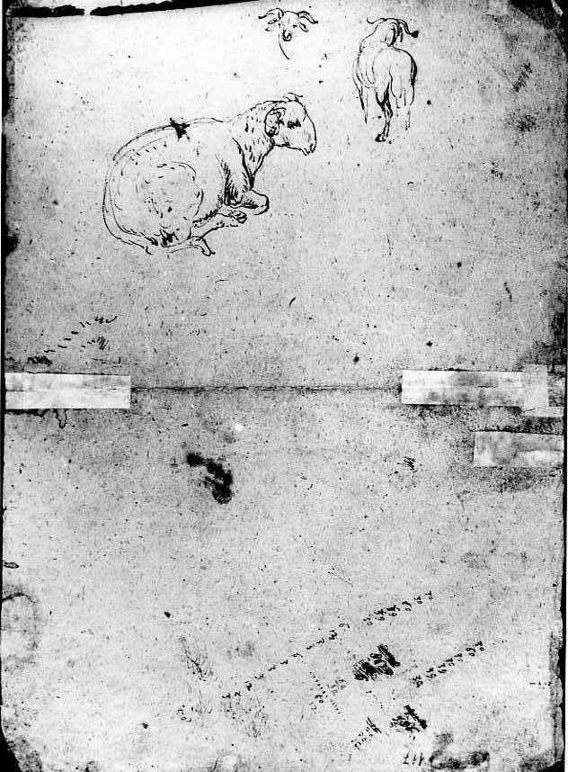 Disegno. Recto:schizzi di alberi dai tronchi e rami sottili,in mezzo ai quali sta un pino ricco di fronde lievemente incurvato a destra. Verso:un montone accovacciato di profilo ad un altro visto da dietro in atto di camminare