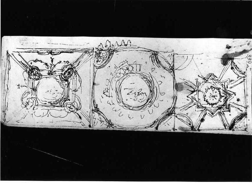 Studio di soffitto. Si susseguono tre scomparti quadrati, ornati diversamente: con cassettone stellare al centro da cui si dipartono vele, con un motivo circolare roteante, con quattro trapezi costolonati raccordati al centro da un quadrato con circonferenza inscritta