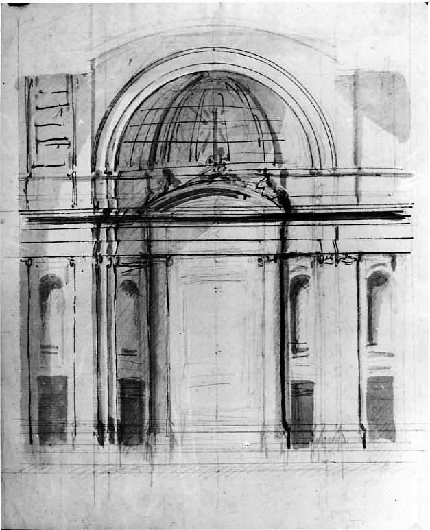 - NOTIZIE STORICO CRITICHE Identificato dubitativamente dal De Seta come studio per l'altare maggiore della chiesa del Gesù ad Ancona, il foglio deve essere riconosciuto come tale sebbene nella messa in opera alcuni elementi non hanno rispettato il progetto vanvitelliano. Al posto delle colonne ioniche ai lati dell'edicola dell'altare, ora si trovano paraste corinzie che sostengono un timpano triangolare; le nicchie laterali si sono tradotte in edicole trabeate, ma la partitura dell'abside in tre spicchi è identica. Il foglio probabilmente è una prima idea che ha subito variazioni lungo la fase progettuale non altrimenti testimoniata da nuovi disegni. L'architetto attese all'opera in tempi non lunghi, sebbene si trattasse di una ricostruzione, piuttosto che di una ristrutturazione di una chiesa precedente eretta nel 1605; il Gesù fu terminato nel 1743 e soprattutto in alcuni dettagli strutturali dell'interno anticipa certe caratteristiche dell'Annunziata di Napoli o, come nel disegno in oggetto, la parete di fondo con altare della Sacrestia di S. Agostino a Roma