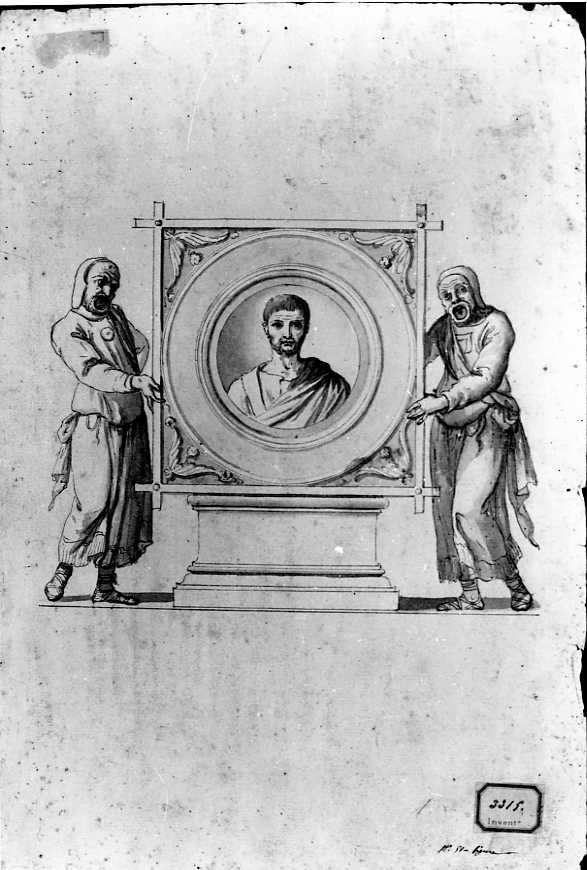 Due figure con volto coperto da maschera teatrale affiancano e sorreggono un quadro clipeato, poggiato su di un piedistallo, entro il quale è inserito un ritratto virile a mezzo busto, forse quello di Terenzio