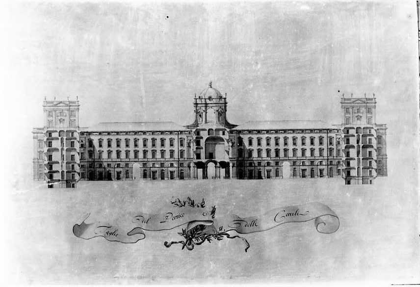 Raffigurazione del prospetto interno,della sezione del portico e dei cortili della Reggia di Caserta. Una scritta didascalica corre su un nastro svolgentesi da un ramoscello di ulivo