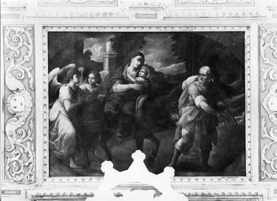 Il dipinto, di forma ovale, raffigura la fuga della sacra famiglia: la scena è ambientata in un paesaggio collinoso ed alberato. Sulla destra procede S. Giuseppe che tiene le briglie all'asino su cui siede la Madonna con Gesù Bambino in braccio. Dietro camminano due angeli
