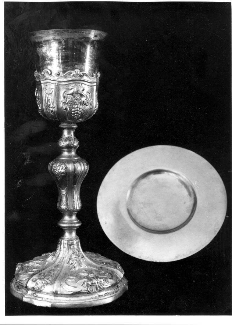 Su piede circolare, decorato con spighe di grano, volute e foglie, fusto con decorazioni a grappoli d'uva e nodo con palmette. Coppa decorata a grappoli d'uva, motivi floreali e volute. Patena dorata