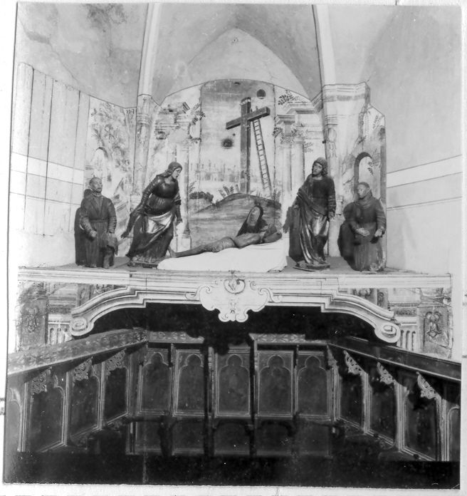 Gruppo di sei sculture raffiguranti da sinistra un uomo inginocchiato con vestito marrore di foggia tardo cinquecentesca, la Maddalena in piedi piangente con le braccia aperte e la veste rossa, l'Addolorata in ginocchio con veste bianca e nera, San Giovanni Evangelista con veste verde scura in atteggiamento dolente, un uomo in ginocchio con saio marrone. Il gruppo è sistemato su un palco sul coro. Sullo sfondo la parete è affrescata e raffigura il Calvario con la croce a cui è appoggiata una scala, e si vede un paese sullo sfondo. Il lato anteriore del palco è in legno dipinto con una finta architettura ed un fregio ornato da volute al centro