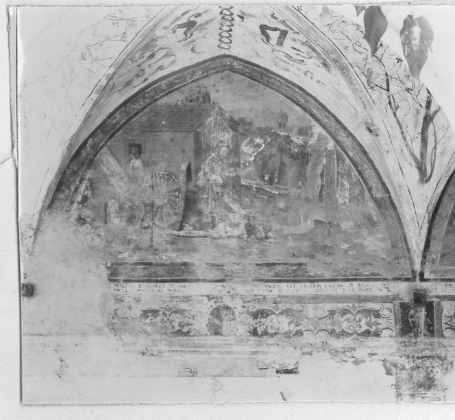 - NOTIZIE STORICO CRITICHE Il ciclo pittorico è di opera di un artista di provincia che accoglie motivi del manierismo tardo e li traduce con un'originale vena narrativa, attenta in alcune scene ai particolari della vita quotidiana, resi con una grande freschezza di spirito anche se con una tecnica non sempre raffinata. Gli sbalzi di qualità fra alcune scene si possono imputare ai vari interventi di aiuti che certo non mancarono. Da una scritta posta nella scena con la Madonna e in Santi Antonio e Francesco si data l'insieme al 1598. Un'altra data, quella del 1729, posta a sinistra dell'ingresso, si riferisce ad un restauro che portò a qualche ridipintura ed all'aggiunta di una fascia decorativa fra le scene ed il pavimento, ora quasi illegibile, essendo scialbata e caduta