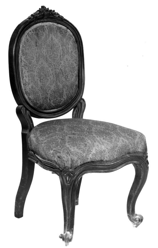 - NOTIZIE STORICO CRITICHE Le sedie, dalla sobria linea curveggiante, si inseriscono nella produzione lignea del primo Ottocento. La decorazione del tessuto è ricorrente tra la fine del '700 e l'inizio del secolo successivo. Le gambe hanno forma caratteristica della metà del XVIII secolo
