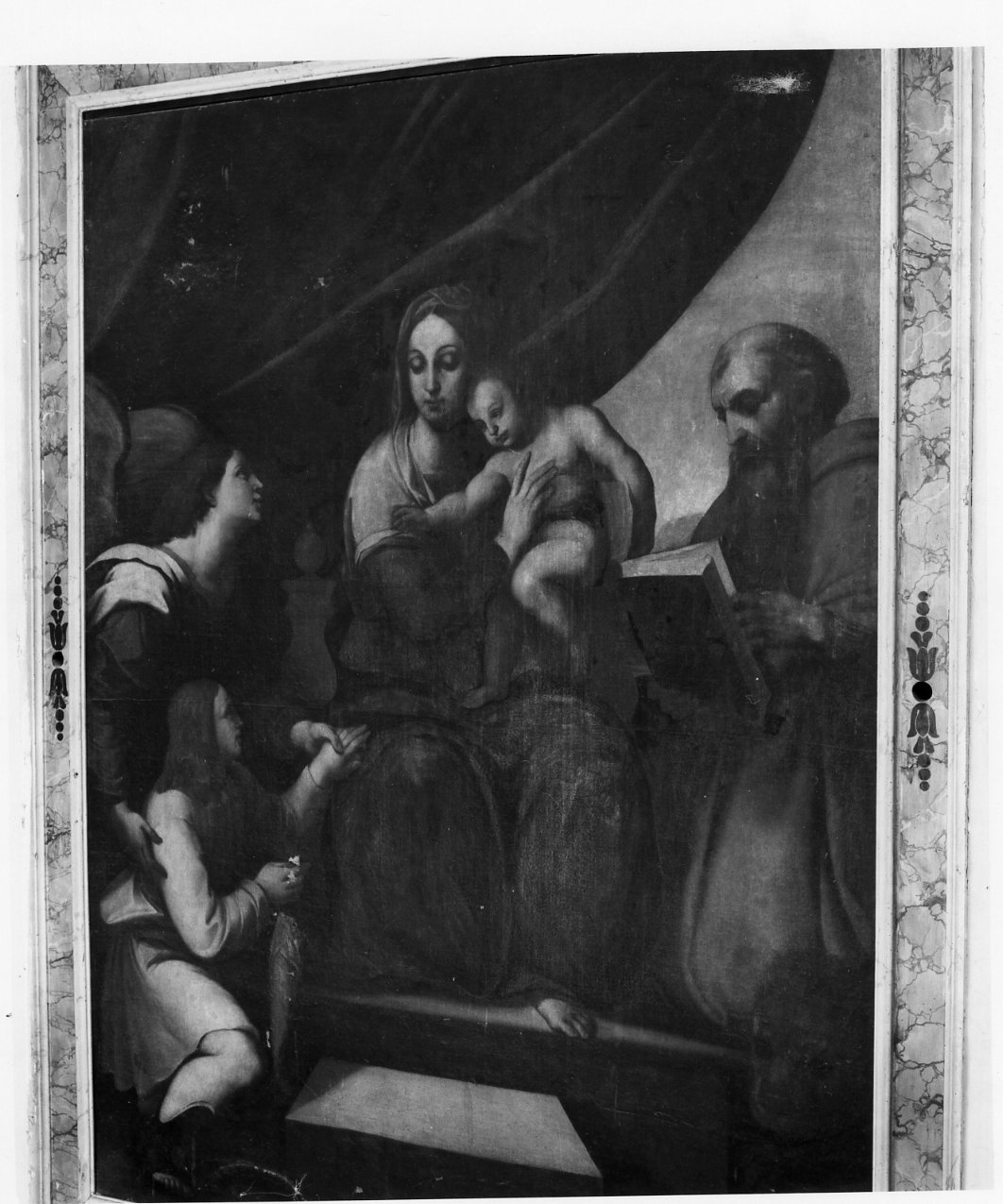 - NOTIZIE STORICO CRITICHE Copia seicentesca di un dipinto di Raffaello del 1512 che adornò nel 1524 la cappella di Giovan Battista del Doce in S. Domenico a Napoli. Il dipinto ha esercitato, sin dalle opere cinquecentesche di Andrea da Salerno e Giovan Filippo Criscuolo - che ne eseguì una copia parziale - grande influenza sui pittori meridionali. Il Filangieri già sottolineava il cattivo stato del dipinto e parlava di "un non buono restauro". E' allaridipinture eseguite in quell'occasione che si può far risalire la differente resa coloristica rispetto all'originale, così come è da notare che nell'opera di Raffaello S. Gerolamo volge lo sguardo verso il gruppo che avanza, anzichè continuare la sua lettura come avviene nella copia