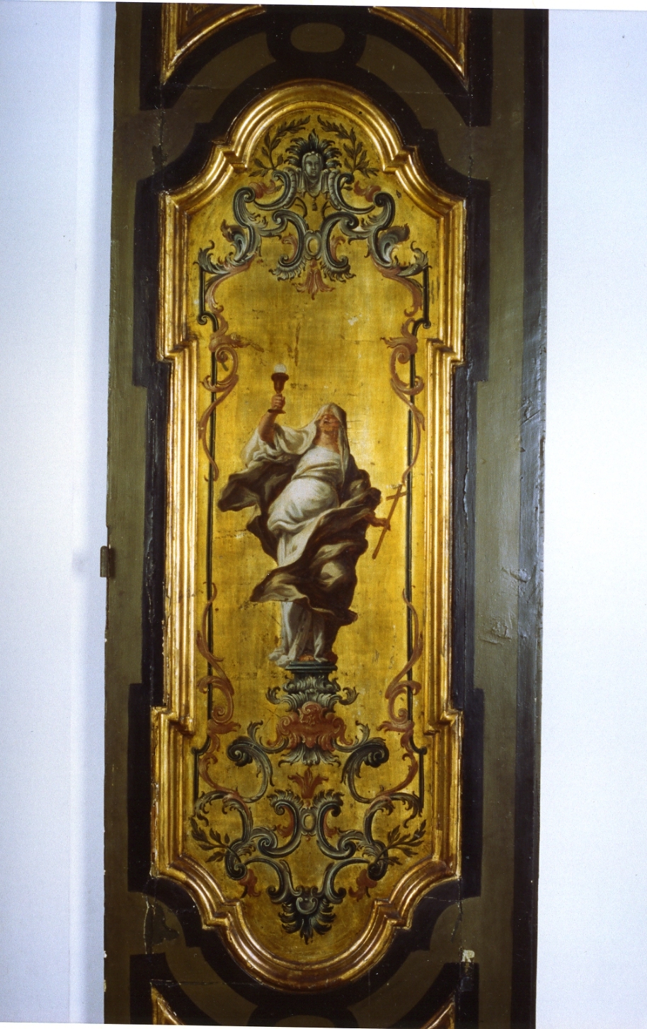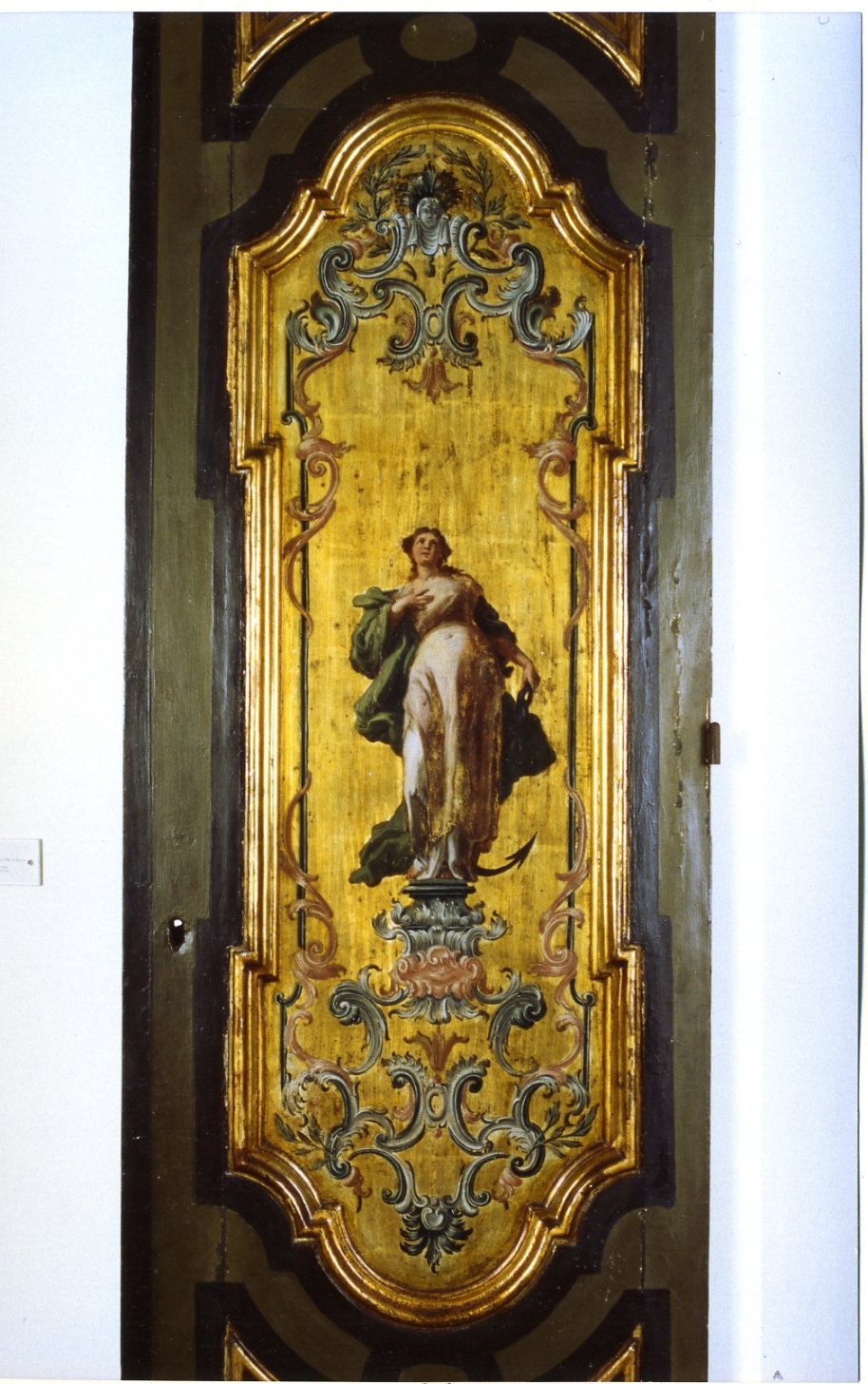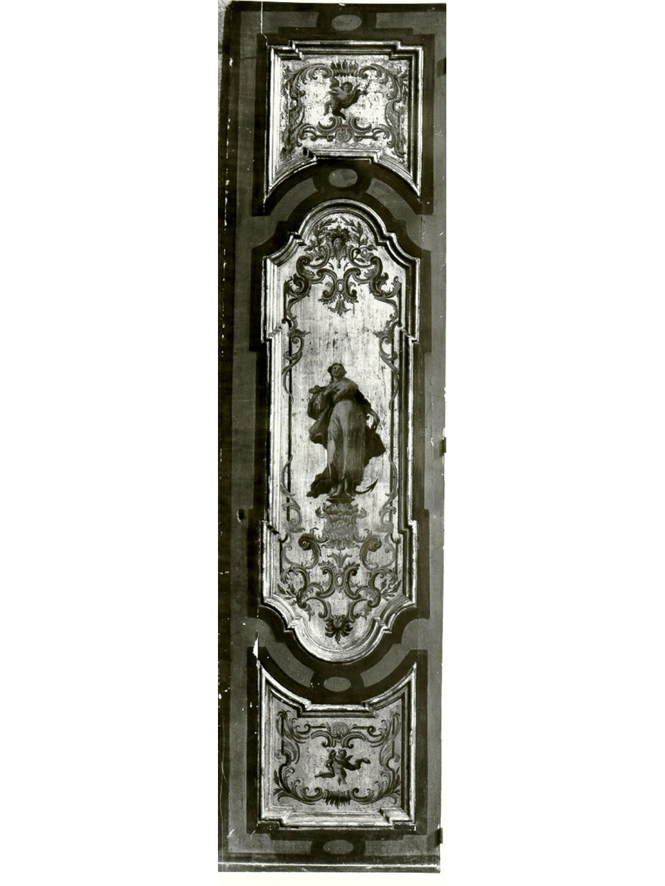 - NOTIZIE STORICO CRITICHE Il gusto racaille presente in questi battenti, ravvisabile sia negli ornati sia nelle fugure sciolete da ogni durezza compositiva, sembre collegarsi ai pannelli di una portantina che il Falciatore dipinse intorno alla metà del XVIII secolo