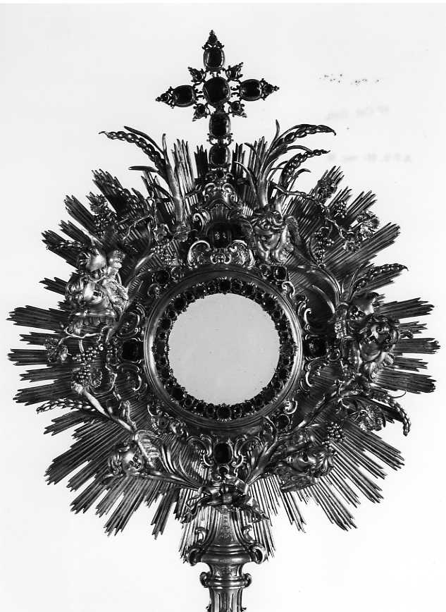 Ostensorio di argento con teca circolare a raggiera ornata da spighe di frumento, tralci di vite e serafini. Paste vitree di diverso colore incastonate all'interno e all'esterno della teca e sulla croce alla sommità