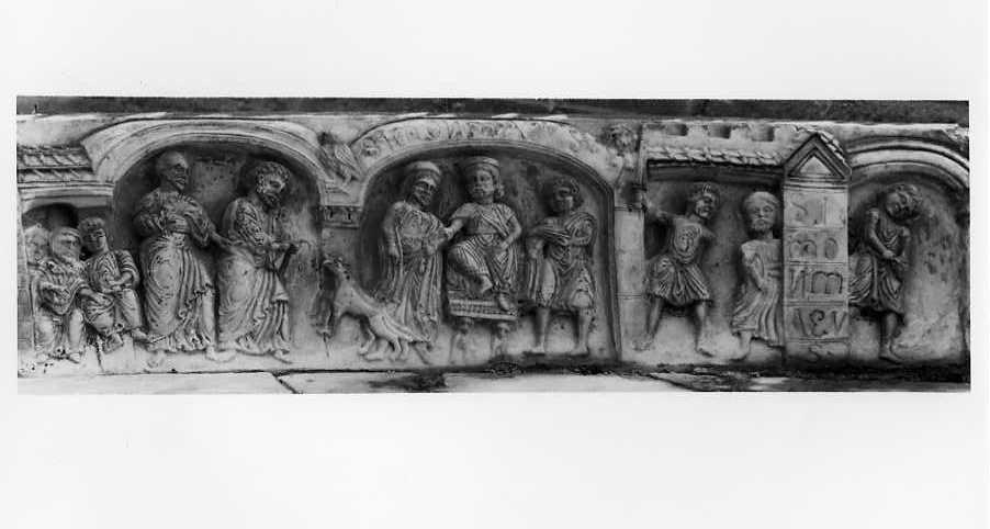 Il rilievo raffigura da destra: la cacciata di Simon Mago; Pietro dà il pane d'orzo ai cani aizzati da Simon Mago