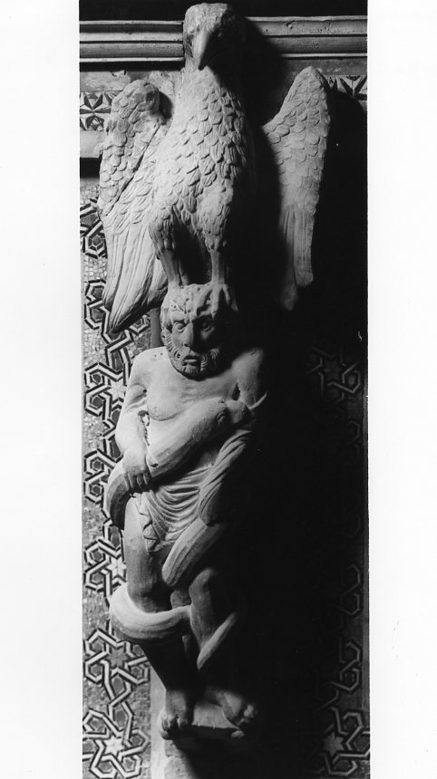 - NOTIZIE STORICO CRITICHE Scrive il Pace: "Questo motivo figurativo è frequente sui pulpiti campani indubbiamente contaminato da presupposti antichi. Avvolto nella spire del serpente era infatti nell'iconografia pagana l'Arion, simbolo del tempo, che può aver fornito l'origine prima del motivo compositivo, qui verosimilmente caricato di un ulteriore senso simbolico: quello del peccato, per via dell'immagine del serpente che morde l'uomo artigliato dall'aquila, che nell'iconografia cristiana rimanda già di per se all'Evangelista Giovanni. Può ritenersi dunque che il significato di fondo sia la vittoria del Vangelo sui tempi pagani del peccato"