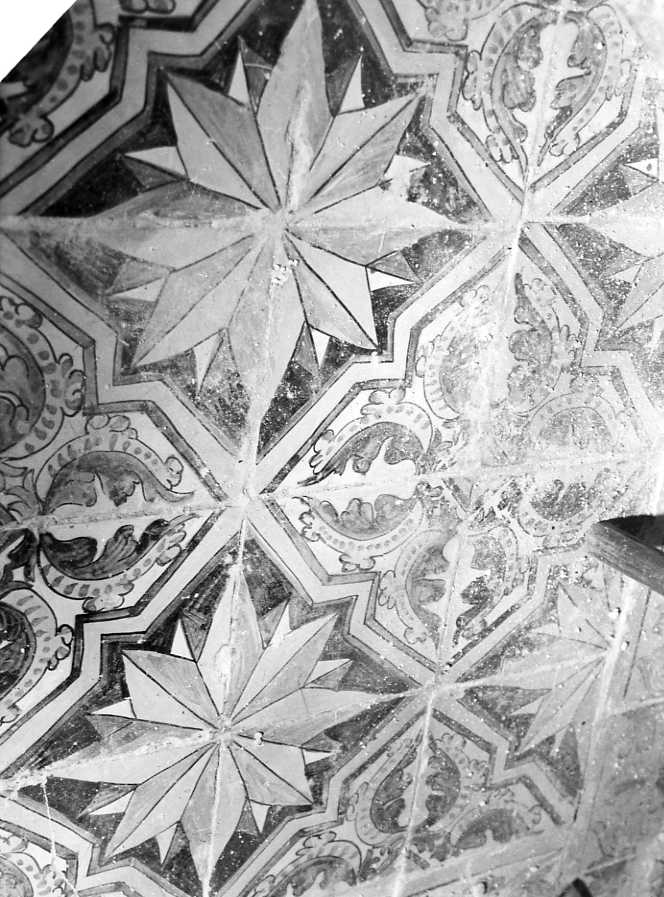 Maioliche decorate con stella centrale e motivi vegetali di colore bianco, giallo, verde, bruno e azzurro