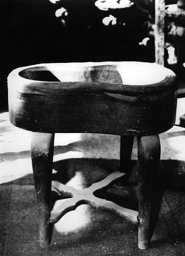 La vasca in bronzo, bordata di velluto rosso, poggia su delle semplici gam be lignee a fusto liscio e leggermente arcuate. In basso ad unie le quattr o gambe del bidet, una croce con le quattro braccia sagomate