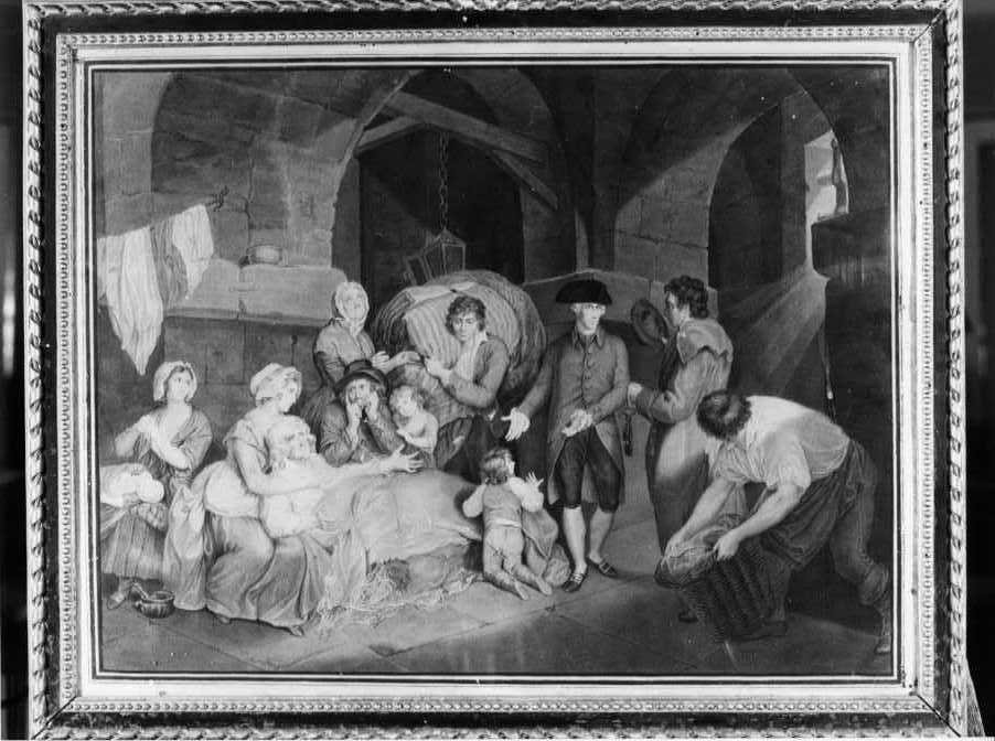 - NOTIZIE STORICO CRITICHE L'incisione è schedata come episodio della vita di Maria Antonietta di Francia ed è pendant della scheda 70857, ma la scena qui raffigurata non consente di individuare specificatamente di quale episodio biografico si tratti. All'interno di un carcere un vecchio malato è disteso su un pagliericcio accudito da una giovane donna e circondato da alcuni uomini, donne e bambini. Un uomo in tricorno lo indica ad un altro che tiene delle chiavi nella sinistra
