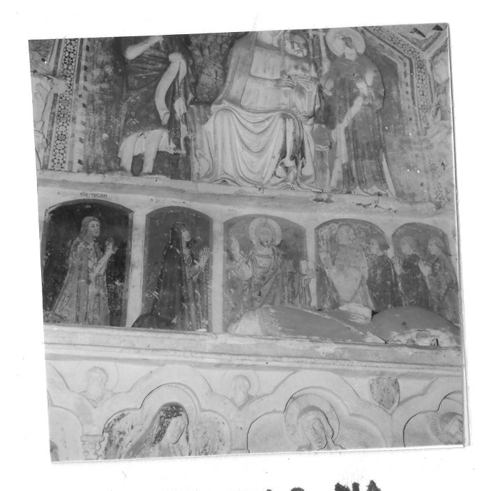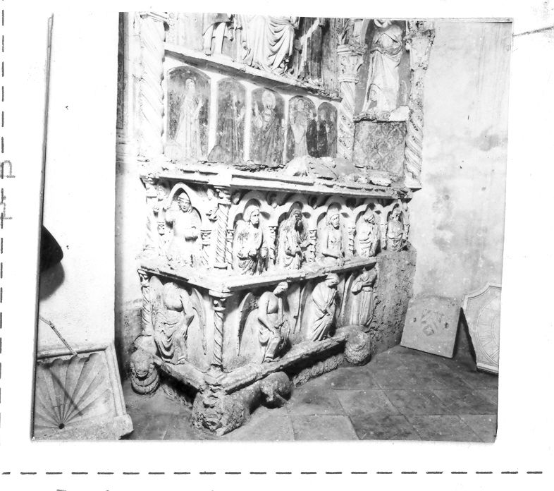 - NOTIZIE STORICO CRITICHE Opera di gusto tardo gotico, modellata sul tipo delle tombe angioine napoletane del sec. XIV, eseguita da uno scultore e da un pittore, per i riquadri dipinti, di ambito provinciale. Quando il Macchiaroli (1868, p. 152) scrive, era già scomparsa l'iscrizione con la data ed il nome del defunto che egli riporta: HIC IACET CORPUS VIRI NOBILIS DOMINI BARTHOLOMEI FRANCONIS MILITIS QUI OBIIT A. D. MCCCCI DIE II MENSIS IUNII. Sui riquadri dipinti vi erano scritti i nomi degli effigiati di cui rimane solo il primo: ALISSANDRA CATERINA, SALVATOR MUNDI, D. RAIMUNDUS, D. ALOISIUS, IACOBUS, THOMASIUS (da sinistra). Gli effigiati ai lati del Cristo dovevano, presumibilmente, essere membri della famiglia del defunto. In una vecchia foto conservata nell'Archivio Fotografico della Soprintendenza alle Gallerie della Campania (senza numero d'inventario), è visibile il monumento ancora con il baldacchino in stucco retto da colonnine tortili, caduto in epoca imprecisabile