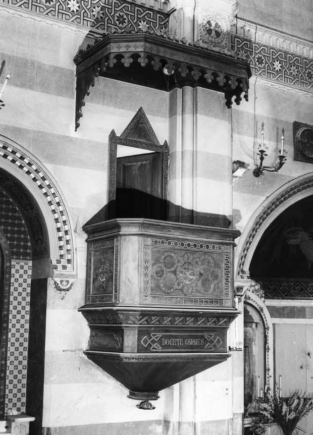 Il pulpito a sezione poligonale consta di una base a piramide tronca rovesciata con corolla apicale sormontata da un prisma la cui faccia anteriore reca un iscrizione. Al di sopra di una fascia ornata con rosette e linee seghettate è il corpo centrale che presenta tre pannelli decorati con medaglioni intersecati tra di loro, di cui quello centrale racchiude sul pannello anteriore l'emblema dell'ordine francescano e sui pannelli laterali una croce tra rosette. Lignea è anche la porticina d'accesso al pulpito con intagliati motivi geometrici sugli stipiti ed un angelo sul frontespizio triangolare. Della stessa materia è anche il baldacchino sovrastante bordato di triogli