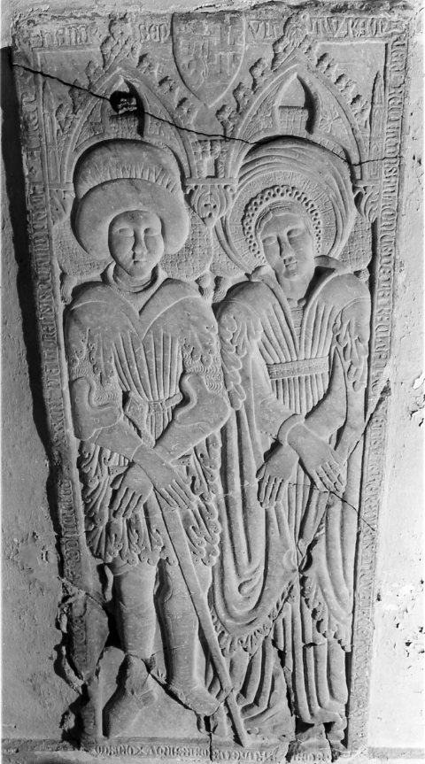 - ISCRIZIONI lungo i bordi, dal lato sinistro - HANC SUPULTRAM/ FIERI FECIT DNS ANTONIUS [---] DE RACTA [---] ET SUIUS HEREDIBUS IN QUA IACET CORPUS MAGNIFICEN/ TISSI ME MARGARITE DE MARZANO UXORIS/ [---] ANO DNI MCCCC [---]XXXVII DIE III MENSIS OCT(---) IND(---) PRIMA AMEN - caratteri gotici -