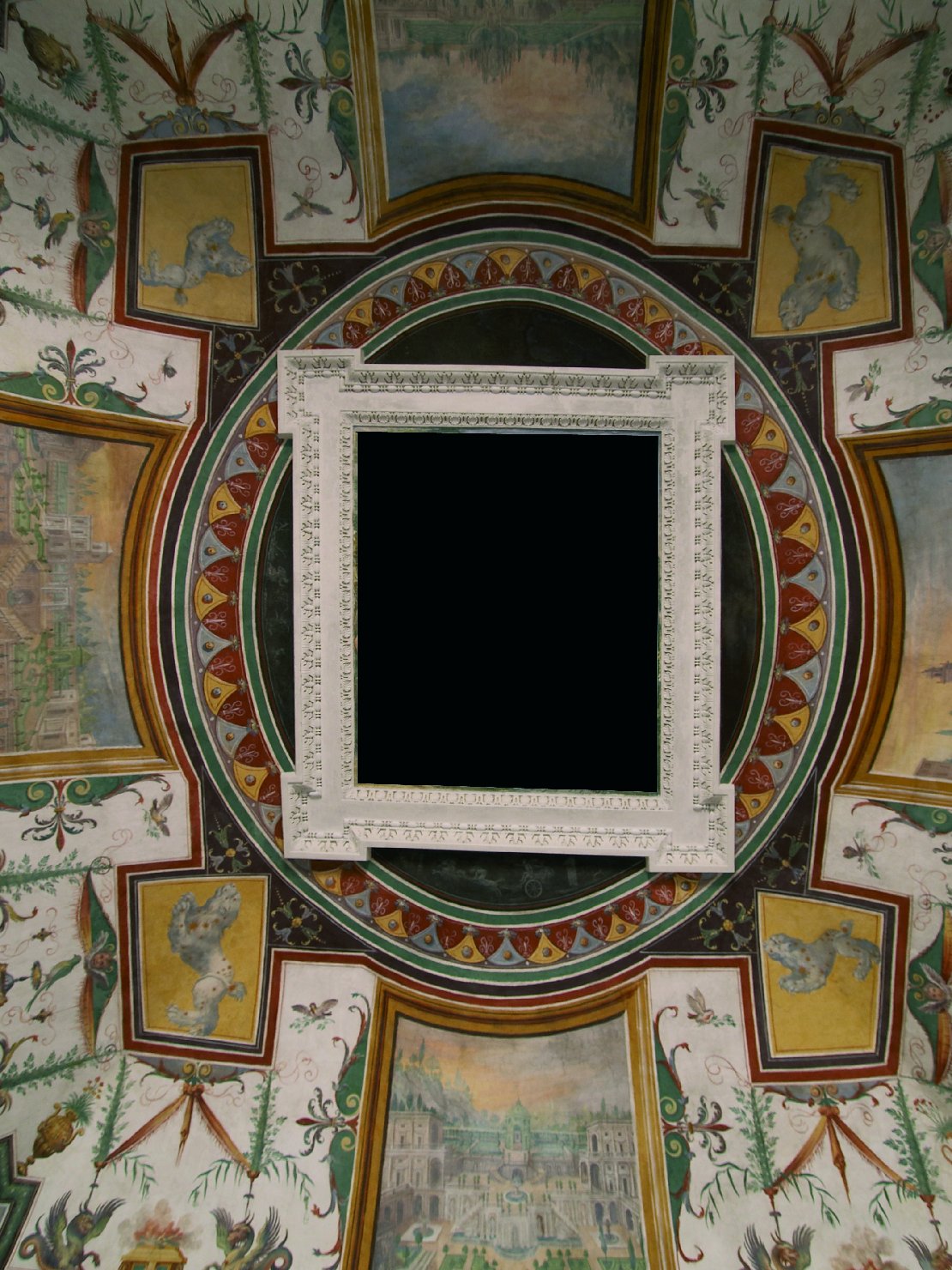 Motivi diversi di palmette e conchiglie per la decorazione in stucco. Triangoli affiancati con all'interno borchiette variopinte per la decorazione pittorica