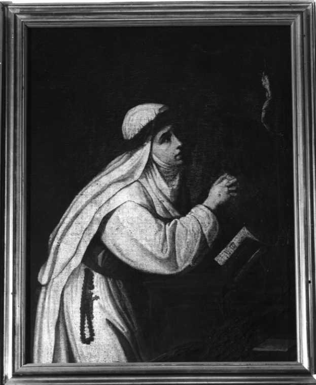 La figura della Santa viene rappresentata in atto di adorazione del Crocifisso, e siccome appare dipinta con busto spinto in avanti in atteggiamento disperato, sembra chiedere al Redentore una grazia impellente. Il breviario mostra le sue pagine quasi sfogliate dal vento. Le mani della Santa, strette in salda presa, mostrano le stimmate