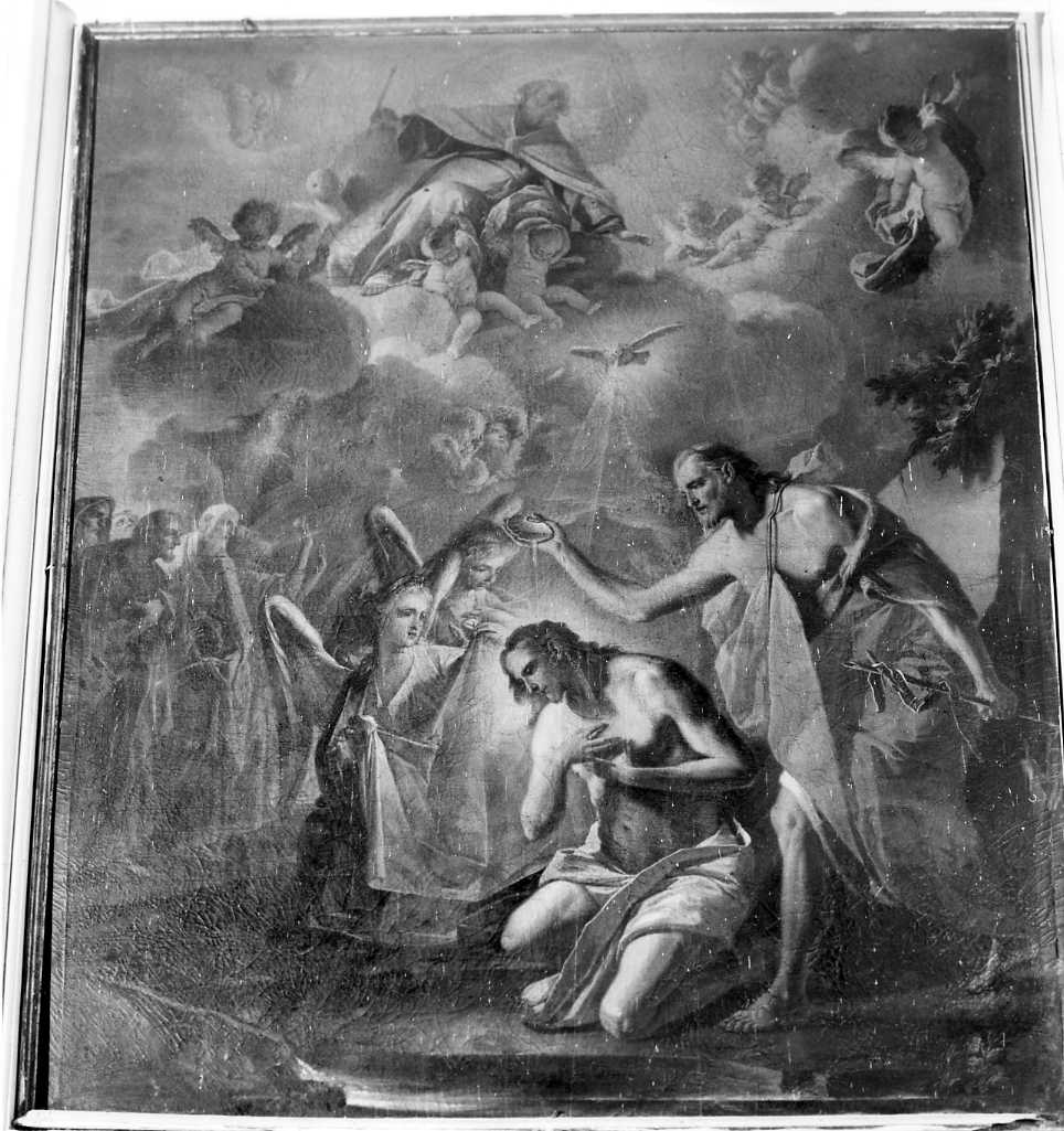 Il Cristo inginocchiato al centro riceve il battesimo da S. Giovanni che si china su di lui dalla destra. Due angeli ed una folla di fedeli sullo sfondo assistono alla scena, mentre in alto, con lo Spirito Santo compare il Padre eterno attorniato da angioletti