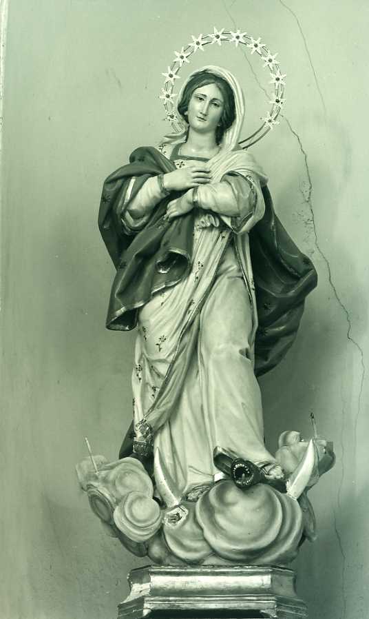 Al di sopra dei simboli canonici del male, il serpente e la mezza luna, c'è la Madonna con una veste verde ed un manto blu azzurro manganese. Entrambe le mani sono portate al cuore in segno di fede