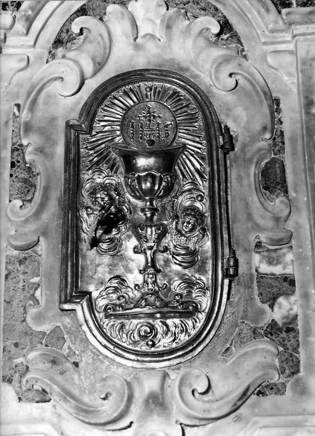 Sportello di tabernacolo in argento. Al centro dello sportello compare un calice fiancheggiato da cherubini