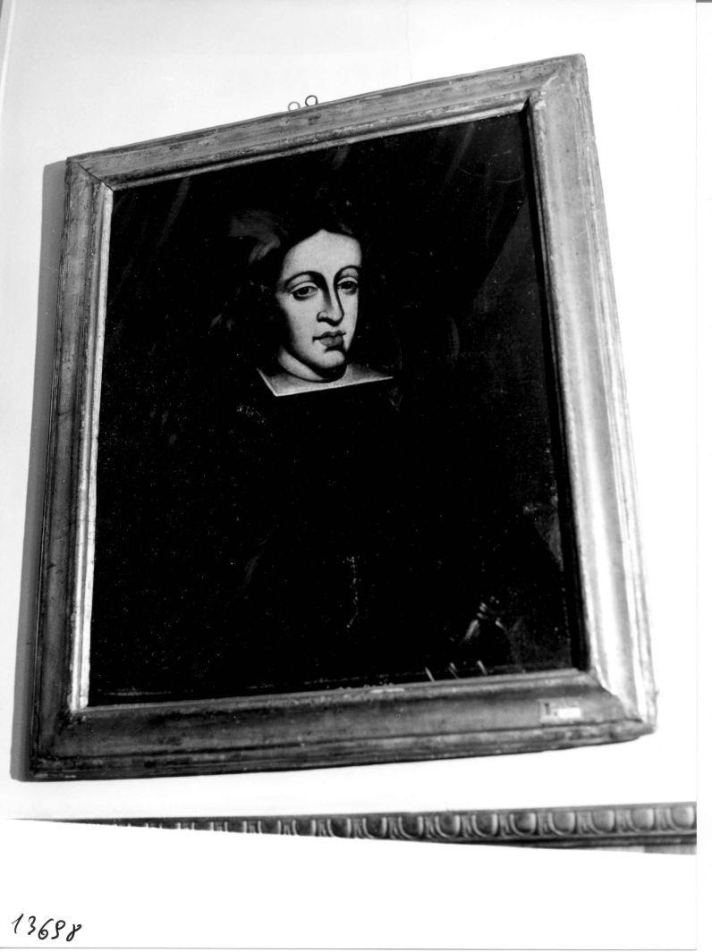 - NOTIZIE STORICO CRITICHE Il dipinto è probabilmente un ritratto della galleria dei personaggi cavesi; però ha subito un massiccio rifacimento nella zona del volto e dei tagli nella tela che ne hanno ridotto le dimensioni. La tipologia del ritratto, la composizione della scena, rinviano al ritratto di Carlo V della serie. L'abito scuro con il rigido collo, quadrato collegano questa figura alle altre due della serie. Che rappresentano personaggi del '700, ciò consente di ritenere che si tratti di un personaggio importante, forse reale