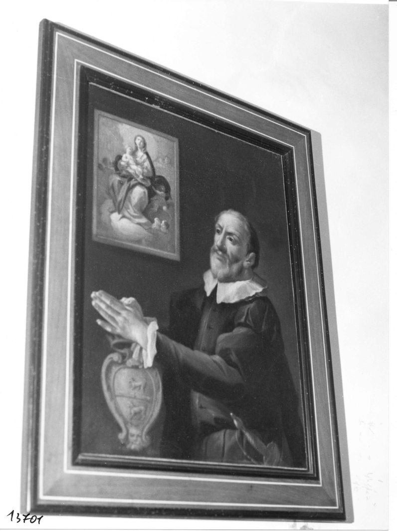 Il dipinto raffigura un uomo posto di 3/4 che con le mani giunte, appoggiate ad uno stemma di pietra, prega la Vergine con Bambino, in un quadretto a a destra