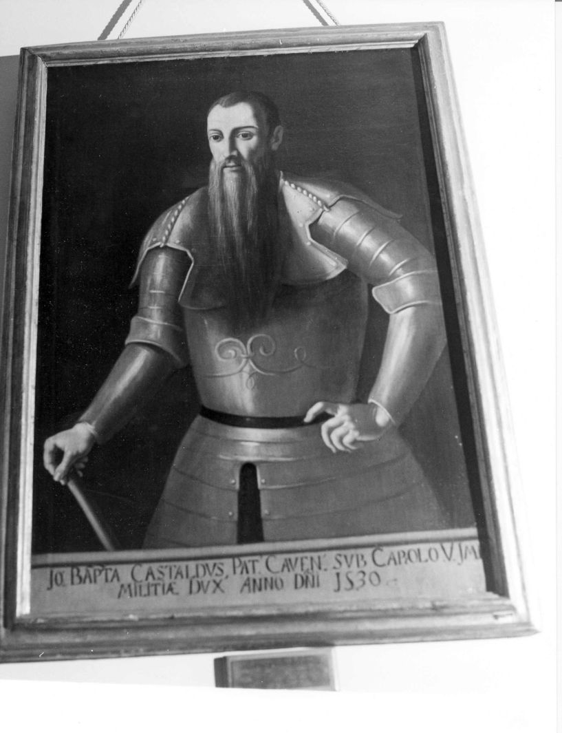 G.B. Castaldo generale della milizia di Carlo V, è rappresentato in piedi, con la corazza. La mano destra si appoggia ad un bastone e la sinistra sul fianco. Il tentativo da parte del pittore di porre la figura di tre quarti e dare l'idea del la profondità spaziale è mal riuscita infatti, la spalla destra si presenta in una posizione innaturale. Numerosi i pesanti ritocchi nella zona della testa e delle mani