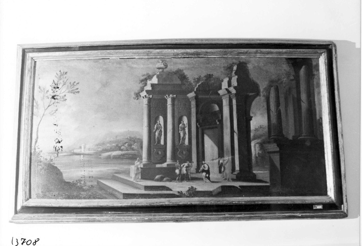 Il dipinto è una veduta con rovine e figure sull' acqua. A riva si erge la facciata di un edificio diruto, con nicchie e statue alternate a colonne, un pilastro a destra, su un alto zoccolo due colonne spezzate. Sulla sinistra si apre un paesaggio marino o lacustre, raccontato con pennellate rapide, dal grande effetto atmosferico culminante nel cielo con nuvole al tramonto. L'edificio costituisce un grandioso fondale per la scena popolata di figurette, monumentali, nello sviluppo verticale e nei colori forti degli abiti antichi. Una donna viene trattenuta da due soldati, un uomo tiene in braccio un bambino, mentre di lato due uomini commentano la scena. Uno è provvisto di mantello rosso. La scena potrebbe rappresentare la strage degli innocenti, come lascia supporre il collegamento con gli altri quattro dipinti con soggetti del Vangelo. Notevole la cornice a rilievo in stucco dorato