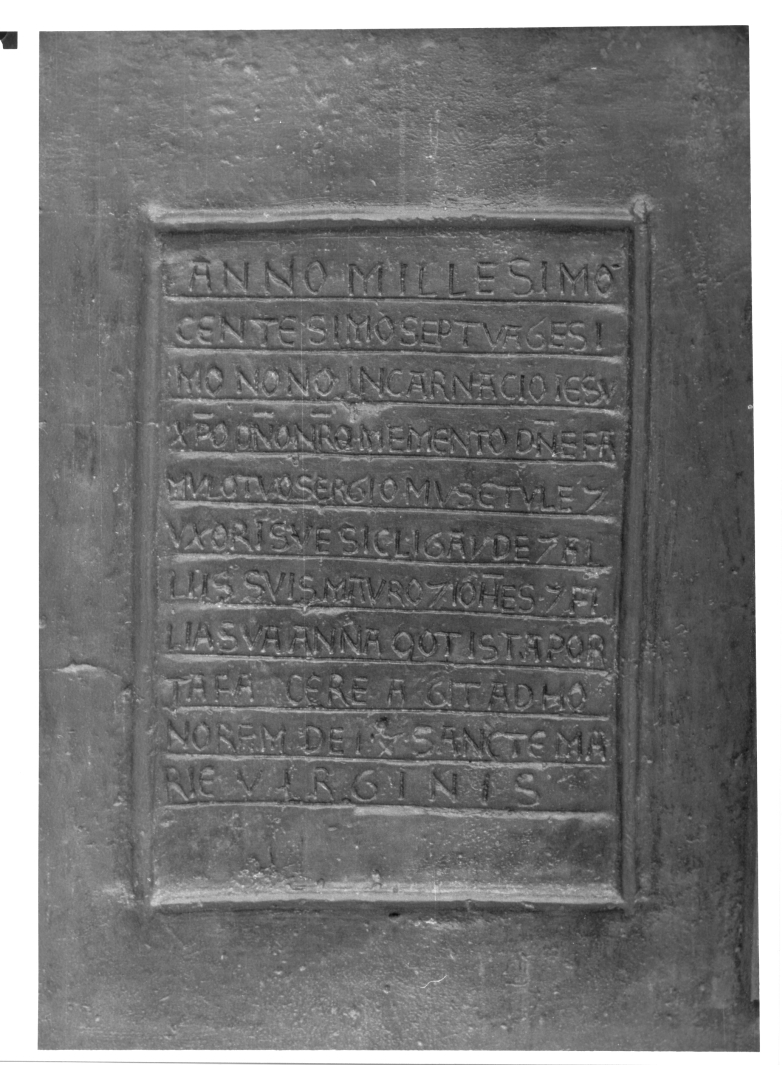 - ISCRIZIONI ANNO MILLESIMO/ CENTESIMO SEPTVAGESI/ MO NONO INCARNACIO IESV / XPO DNO NRO MEMENTO DNE FA/ MVLO TVO SERGIO MVSETVLE 7/ VXORI SVE SICILIGAVDE 7 FI/ LIIS SVIS MAVRO 7 IOHES 7 FI/ LIA SVA ANNA QOT ISTA PORI TA FACERE AGIT AD HO/ NOREM DEI 7 SANCTE MA/ RIE VIRGINIS -