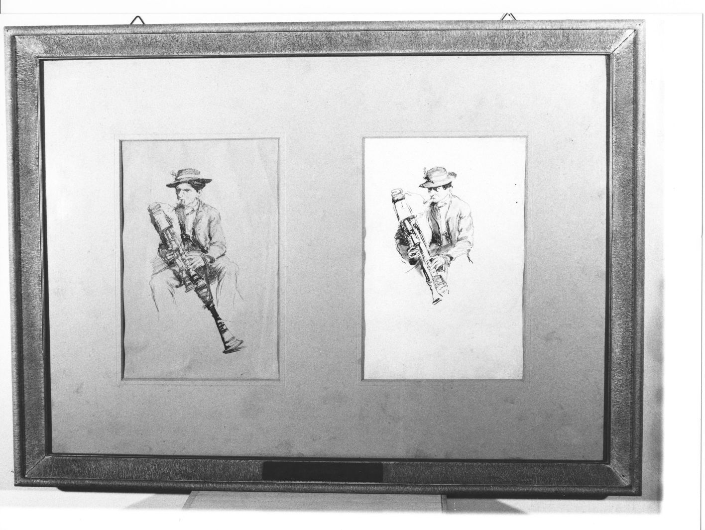 I due disegni sono eseguiti con tratto veloce e sommario. In entrambi la raffigurazione è simile: un uomo seduto con giacca e cappello a falde, mentre suona una zampogna. Tuttavia, soprattutto, nel primo disegno l'artista ha rivolto una particolare attenzione alla definizione dello strumento musicale
