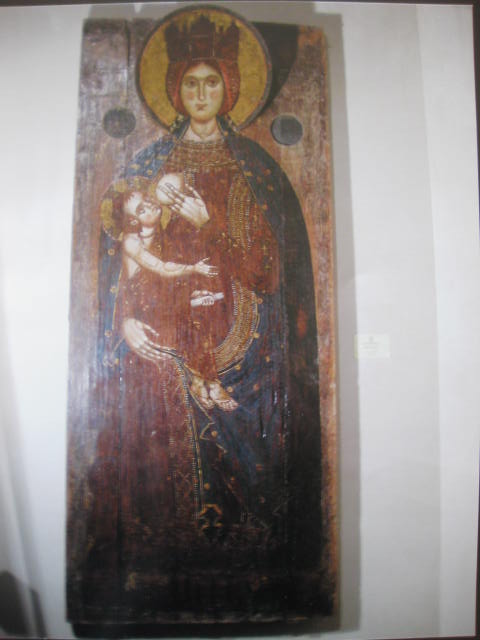 La pala, originariamente oggetto di culto, rappresenta la Vergine assisa sul trono con il Bambino. La Madonna è iconograficamente del tipo frontale, raffigurata nella sua veste di imperatrice celeste ed allattante. La testa è dipinta su di un tondo distinto, sovrapposto ed incastonato nella tavola. Il capo è sovrastato da una imponente corona con apici a palmetta, al di sotto del quale sporge una cuffietta. La Madonna indossa una tunica, la cui stoffa damascata è trapuntata da perline e fili d'oro. La Madonna è coperta da un manto azzurro. Il bambino sostenuto con il braccio destro, mantiene con la mano sinistra il rotolo della legge e con l' altra si accinge a benedire. Ai lati del nimbo si aprono due capselle, un tempo destinate a contenere reliquie della Vergine Maria. In basso a sinistra è visibile una figura di monaco in abito bianco con tonsura e cappuccio, di piccolissime dimensioni, forse l'abbate committente dell'opera. A destra compare una corona gigliata. Infine una cornice decorata con motivi a fogliette color ocra definisce la parte inferiore della tavola