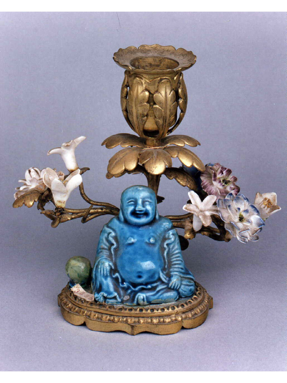 Bugia composta da montatura e statuetta di monaco buddista in porcellana dipinta