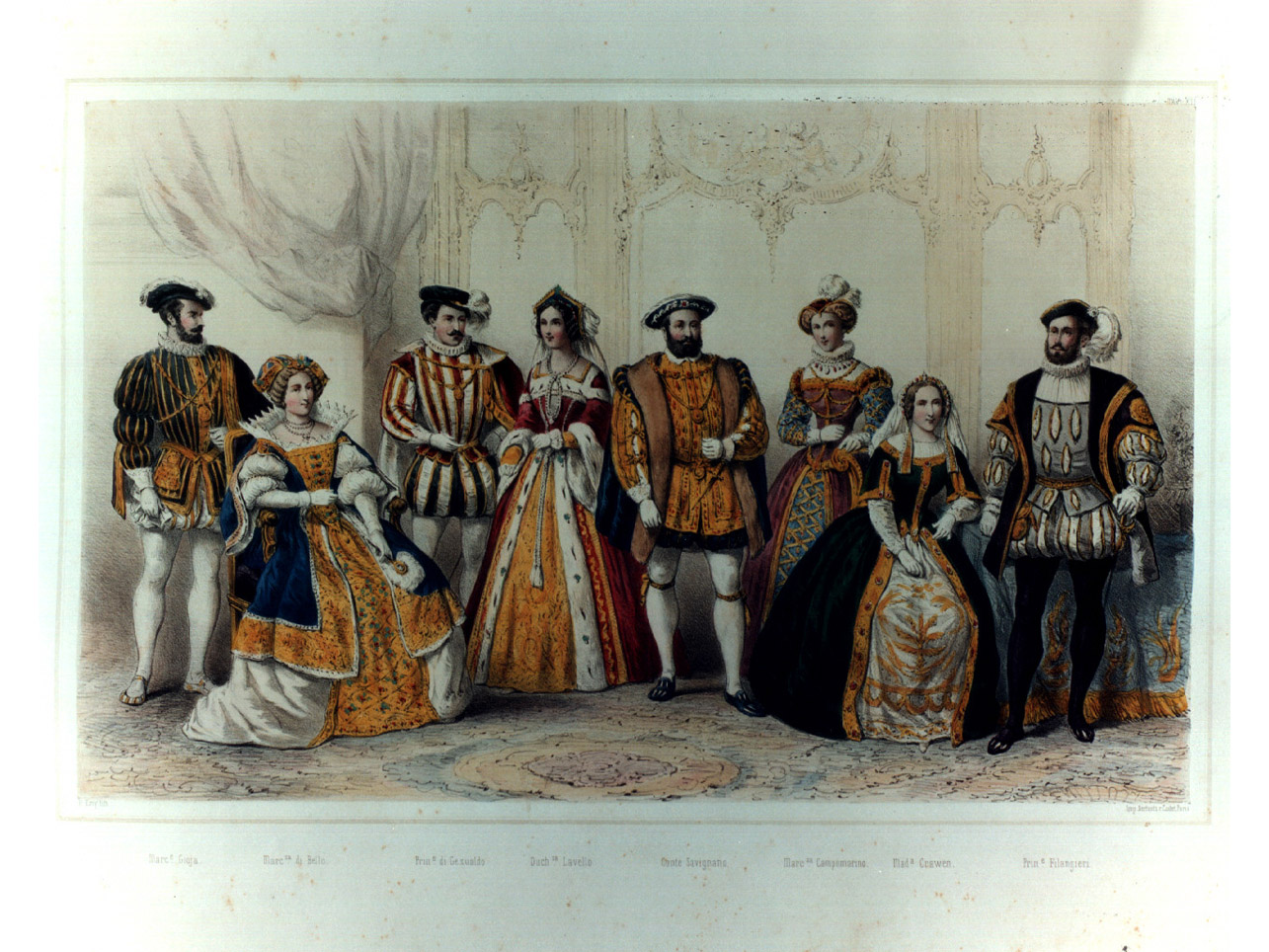 - ISCRIZIONI MARC.E GIOJA.; MARC.SA DI BELLO.; PRIN.E DI GESUALDO.; DUCH.SA LAVELLO.; CONTE SAVIGNANO.; MARC.SA CAMPOMARINO.; MAD.A CRAWEN.; PRIN.E FILANGIERI - corsivo - francese