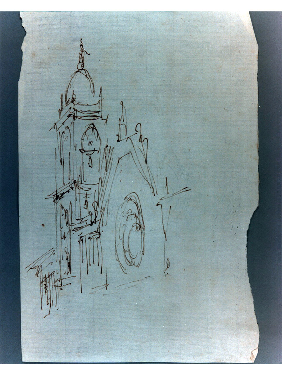 Schizzo scenografico che rappresenta la parte superiore di una facciata di chiesa con rosone affiancata da un campanile