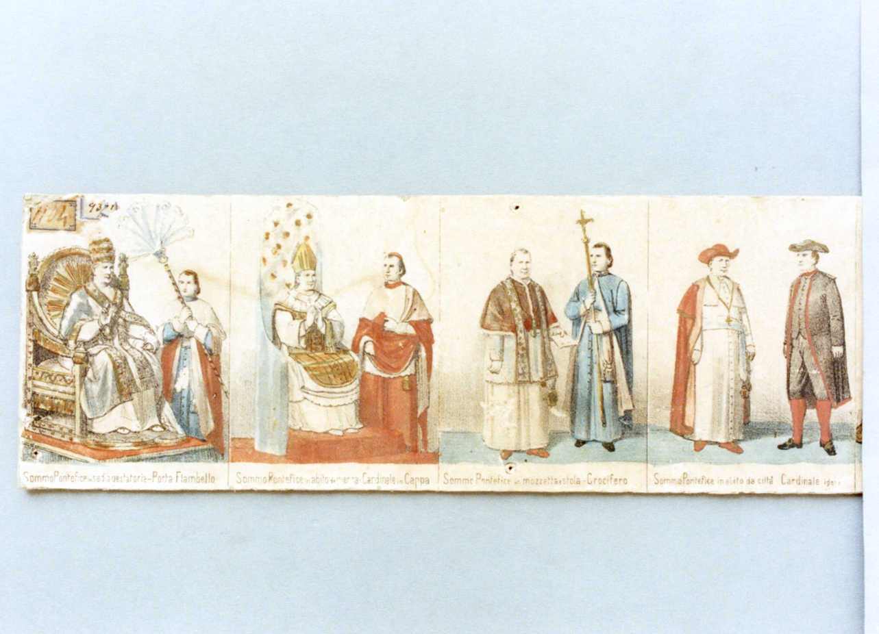 - ISCRIZIONI in basso - SOMMO PONTEFICE IN SEDIA GESTATORIA-PORTA FLAMBELLO SOMMO PONTEFICE IN ABITO DA MESSA-CARDINALE IN CAPPA SOMMO PONTEFICE IN MOZZETTA E STOLA-CROCIFERO SOMMO PONTEFICE IN ABITO DA CITTÀ CARDINALE IDEM - a penna -