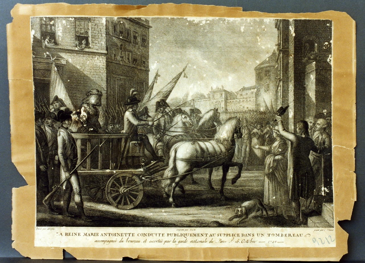 la reine Marie Antoniette conduite pubbliquement au supplice dans un tombereau. episodi della vita di re Luigi XVI