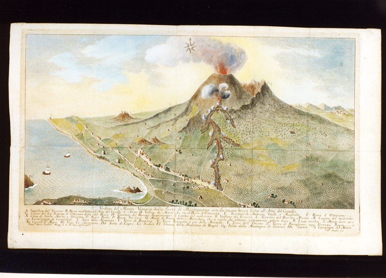 veduta del monte Vesuvio dalla parte di mezzogiorno con la nuova bocca fatta all'atrio del cavallo. veduta del Vesuvio in eruzione