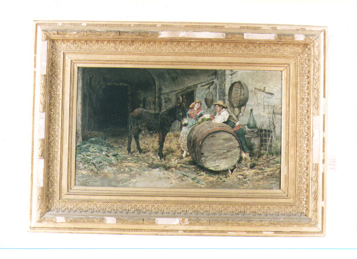 Interno: stalla. Animali: asino. Figure: figura maschile; figura femminile
