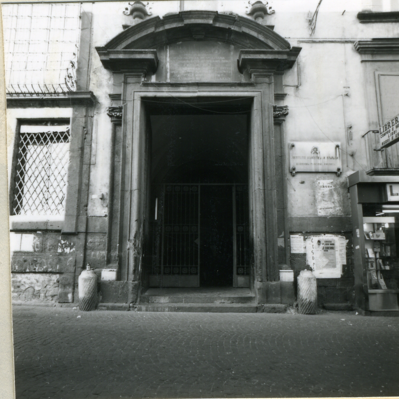 - ISCRIZIONI All'interno del timpano spezzato - ISABELLAE FELTRIAE A ROBORE/ EX URBINI DUCIBUS/ PRINCIPI BISINIANI/ SOCIETAS PROFESSA NEAPOLITANA/ AMANTISSIMAE AEQUE ATQUE AMPLISSIMAE/ FUNDATRICI/ BENEFICII MEMORIAM SEMPER RECENTEM/ SEMPER GRATAM POSTERIS TESTATURA/ IMMORTALE MONUMENTUM/ ANNO A VIRGINIS PARTU MDCLXXXIV -