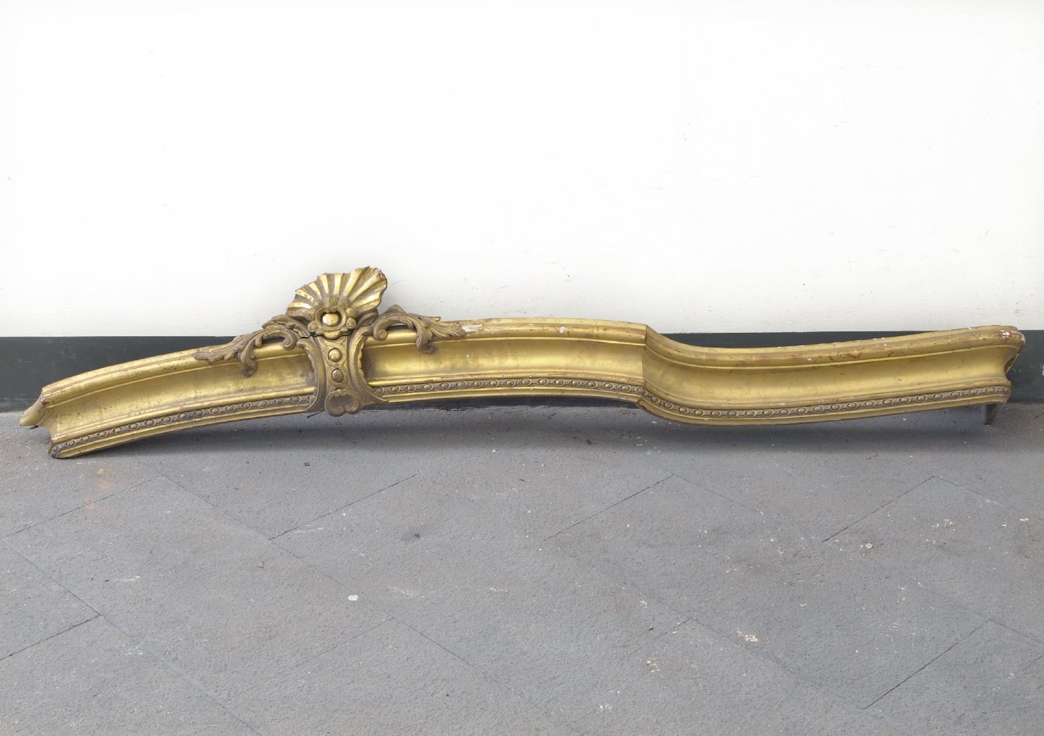Frammento di zinefra in legno modanato dipinto oro con una applicazione floreale in legno