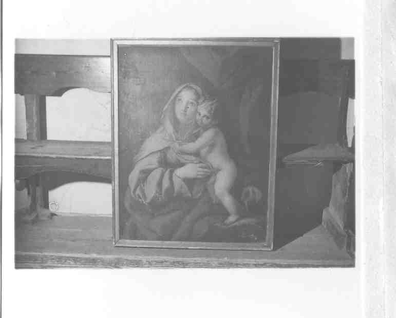 La Vergine è seduta ed è abbracciata al Bambino nudo. Sulla destra un drappo