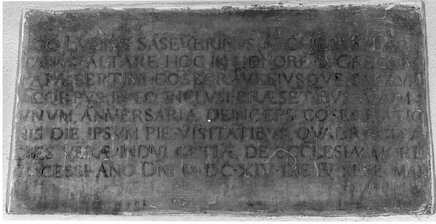 - ISCRIZIONI EGO LUCIUS SANSEVERINUS ARCHIEPISCOPUS SALERNITANUS ALTARE HOC IN HONOREM B. GREGORII PAPAE VII CONSECRAVI EIUSQUE SACRUM CORPUS IN EO INCLUSI, PRAESENTIBUS ANNUM UNUM, ANNIVERSARIA DEINCEPS CONSECRATIONIS DIE IPSUM VISITANTIBUS QUADRAGINTA DIES VERAE INDULGENTIAE DE ECCLESIAE MORE CONCESS/ ANNO DOMINI MDCXIV.DIE, IV MENSIS MAI - lettere capitali - a incisione -