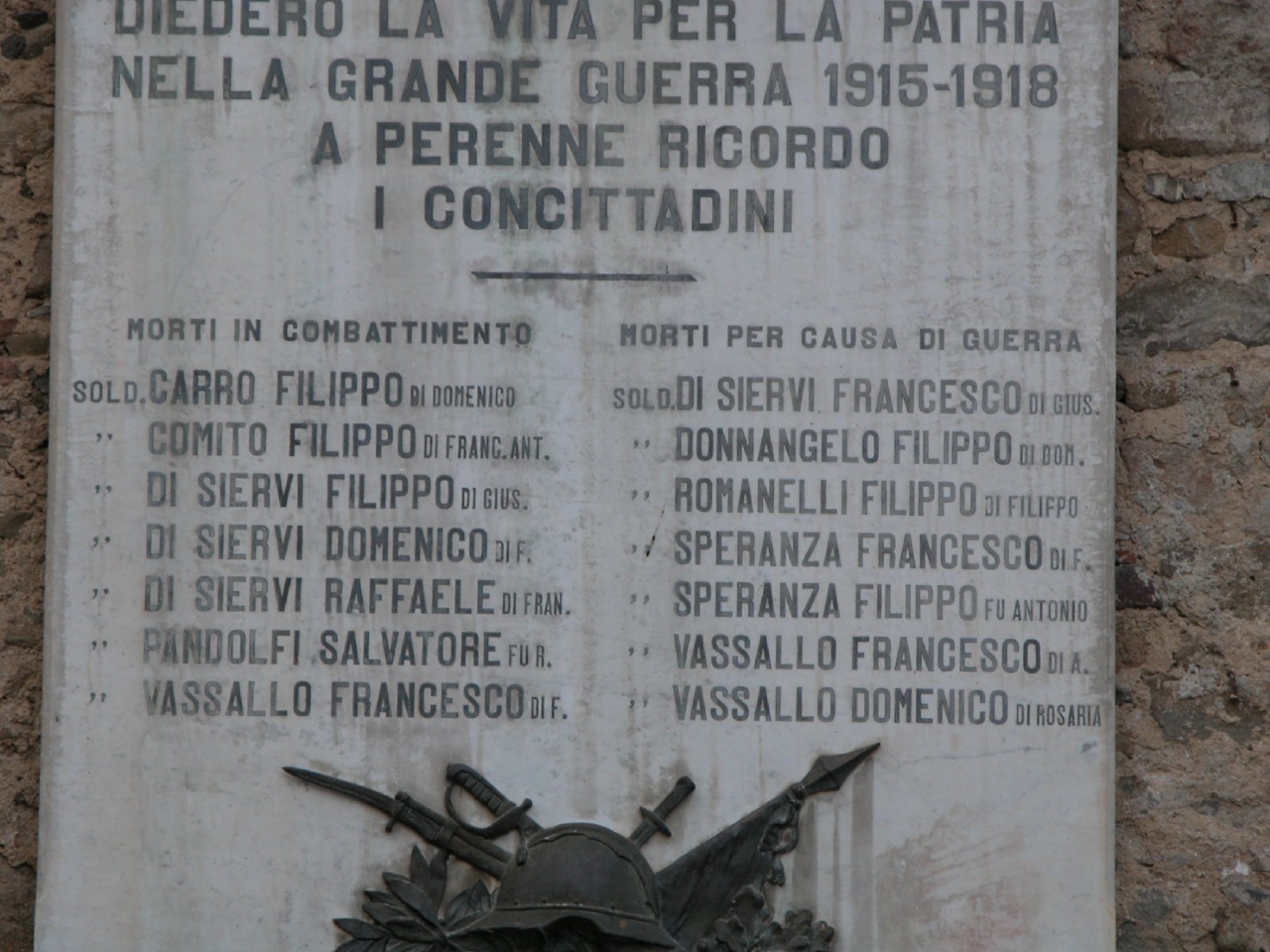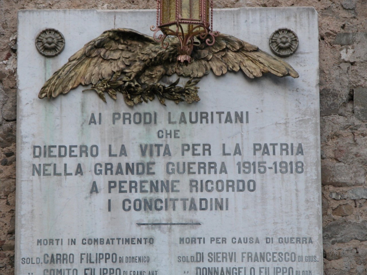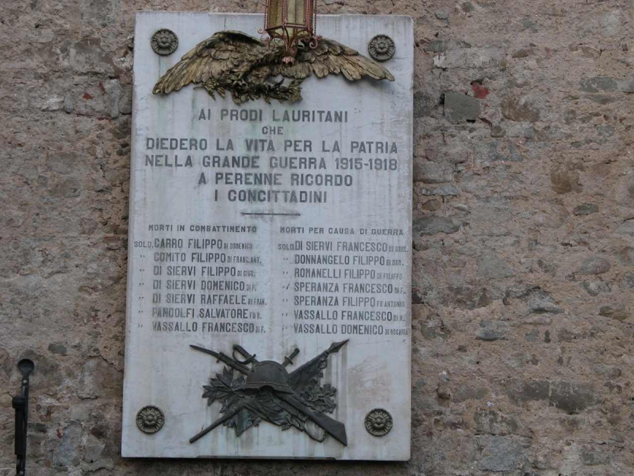 - ISCRIZIONI nel campo - AI PRODI LAURITANI/ CHE/ DIEDERO LA VITA PER LA PATRIA/ NELLA GRANDE GUERRA 1915-1918/ A PERENNE RICORDO/ I CONCITTADINI/ MORTI IN COMBATTIMENTO/ SOLD. CARRO FILIPPO DI DOMENICO/ ‘’ COMITO FILIPPO DI FRANC. ANT./ ‘’ DI SIERVI FILIPPO DI GIUS./ ‘’ DI SIERVI DOMENICO DI F./ ‘’ DI SIERVI RAFFAELE DI FRAN./ ‘’ PANDOLFI SALVATORE FU R./ ‘’ VASSALLO FRANCESCO DI F./ MORTI PER CAUSA DI GUERRA/ SOLD. DI SIERVI FRANCESCO DI GIUS./ ‘’ DONNANGELO FILIPPO DI DOM./ ‘’ ROMANELLI FILIPPO DI FILIPPO/ ‘’ SPERANZA FRANCESCO DI F./ ‘’ SPERANZA FILIPPO FU ANTONIO/ ‘’ VASSALLO FRANCESCO DI A./ ‘’ VASSALLO DOMENICO DI ROSARIA// - lettere capitali - a incisione - italiano