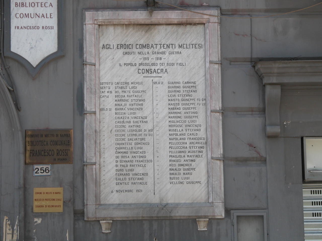 - ISCRIZIONI nel campo - AGLI EROICI COMBATTENTI MELITESI/ CADUTI NELLA GRANDE GUERRA/ 1915-1918/ IL POPOLO ORGOGLIOSO DEI SUOI FIGLI/ CONSACRA/ SOTTOT.TE CAVICCHIO MICHELE/ SERG.TE STABILE LUIGI/ CAP.M.RE DEL PRETE GIUSEPPE/ CAP.LE BOCCIA RAFFAELE/ MARRONE STEFANO/ RINALDI ANTONIO/ SOLD.TO BARRA’ VINCENZO/ BOGGIA LUIGI/ CAIAZZA VINCENZO/ CASOLINO GAETANO/ CECERE ANTIMO/ CECERE LEPOLDO DI A.NIO/ CECERE LEOPOLDO FU D.CO/ CECERE SALVATORE/ CHIANTESE DOMENICO/ CHIARIELLO LUIGI/ CIMMINO VINCENZO/ DE ROSA ANTONIO/ DI GENNARO FRANCESCO/ DI PALO RAFFAELE/ DURO LUIGI/ FERRARO VINCENZO/ GALLO STEFANO/ GENTILE RAFFAELE/ SOLD.TO GUARINO CARMINE/ GUARINO GIUSEPPE/ GUARINO STEFANO/ LEVA STEFANO/ MAISTO GIUSEPPE FU G.NO/ MAISTO GIUSEPPE FU L.GI/ MARANO GIUSEPPE/ MARRONE ANTONIO/ MARRONE GIUSEPPE/ MIGLIACCIO LUIGI/ MORGESE VINCENZO/ MUSELLA STEFANO/ NAPOLANO CARLO/ NAPOLANO FRANCESCO/ PELLECCHIA ARCANGELO/ PELLEGRINO AGOSTINO/ PRAGLIOLA RAFFAELE/ RANUCCI ANTIMO/ RICCI DOMENICO/ RINALDI GIUSEPPE/ RINALDI MARIO/ RUSSO LUIGI/ VELLONE GIUSEPPE// - lettere capitali -