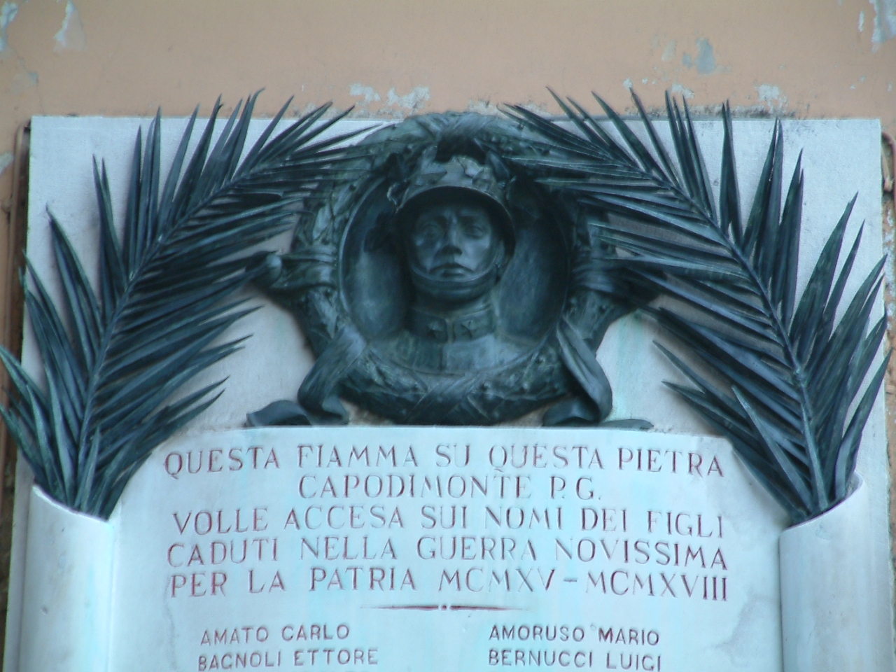 - ISCRIZIONI nel campo - QUESTA FIAMMA PER QUESTA PIETRA/ CAPODIMONTE P. G./ VOLLE ACCESA SUI NOMI DEI FIGLI/ CADUTI NELLA GUERRA NOVISSIMA PER LA PATRIA MCMXV MCMXVIII/ AMATO CARLO/ BAGNOLI ETTORE/ BIANCHI ADOLFO/ CERBONE VINCENZO/ D’AIELLO FILOMENO/ DE MARTINO GIUSEPPE/ DI VAIA SALVATORE/ GIULIANO FERDINANDO/ MAFFEI LIVIO/ MILANESE UGO/ NATALE VINCENZO/ PARZIALE GUGLIELMO/ PASSERO GIUSEPPE/ PEREZ FRANCESCO/ SCARDINATI VINCENZO/ SCHISANO ROBERTO/ VARRIALE SALVATORE/ AMORUSO MARIO/ BERNUCCI LUIGI/ BUONOCORE EDUARDO/ CILIO ROBERTO/ D’AURIA GIUSEPPE/ DE MATTHEIS MICHELE/ FERMAGLIA GIUSEPPE/ CRISI GIUSEPPE/ MARSILIA VINCENZO/ NARDI GIOVANNI/ ODIERNA EDUARDO/ PASSARO PASQUALE/ PERRELLA VINCENZO/ PETRONI EDUARDO/ SINAGRA GENNARO/ TESTA PASQUALE/ ESPOSITO VINCENZO/ MCMXXIII/ G. DI PIETRO// - lettere capitali -